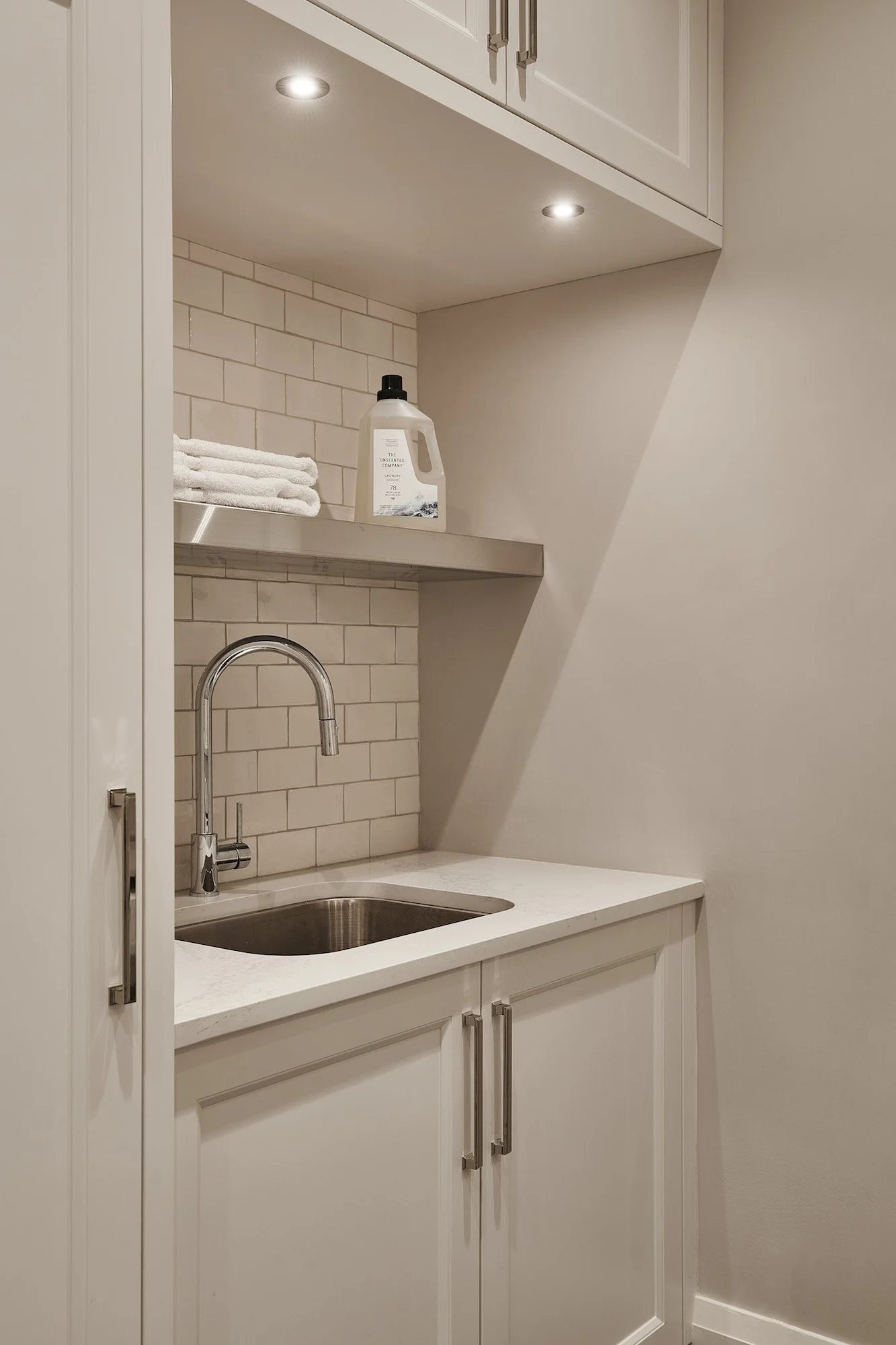 The kitchen was a primary focus, as the owners love to entertain. Gallery walls were created for the clients’ robust art collection. A den dedicated to cocktail hour and perfectly balanced acoustics features historic Bank of Canada Doors and an antique fireplace from a bygone era.