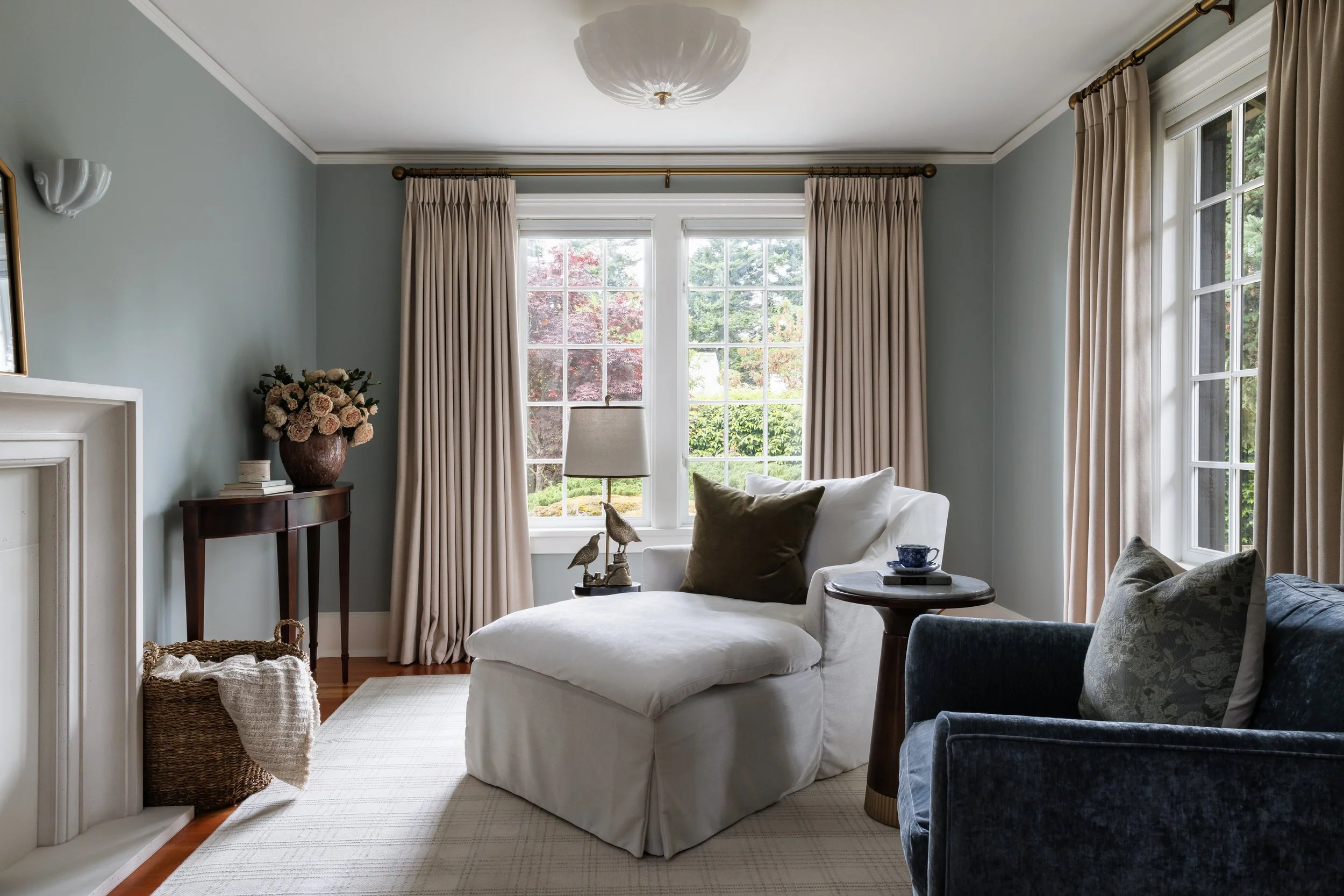Bringing nostalgia back into the interior, we mindfully introduced finishes with an aged vintage quality and prioritized classic motifs designed to feel original to the home. Anchoring the green-hued den with a handmade limestone surround, this space was delicately dressed in milky glass fixtures, rich patinated leathers and cascading linen drapery that filtered the dappled sunlight from the garden beyond.